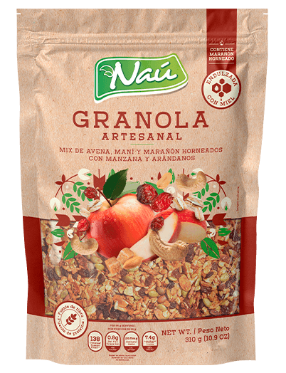 Nueva y deliciosa granola horneada, la combinación perfecta de ingredientes naturales como avena, maní, marañón, manzana, arándanos y lo mejor, endulzada con miel.