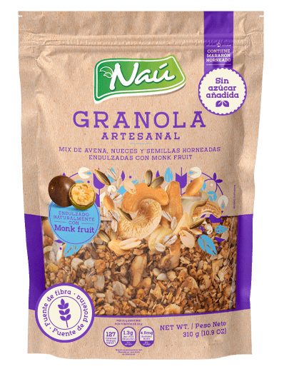 Nueva y deliciosa granola horneada, la combinación perfecta de ingredientes naturales como avena, nueces, semillas y lo mejor endulzada con Monk Fruit, endulzante que no contiene calorías, ni efectos en niveles de glucosa.